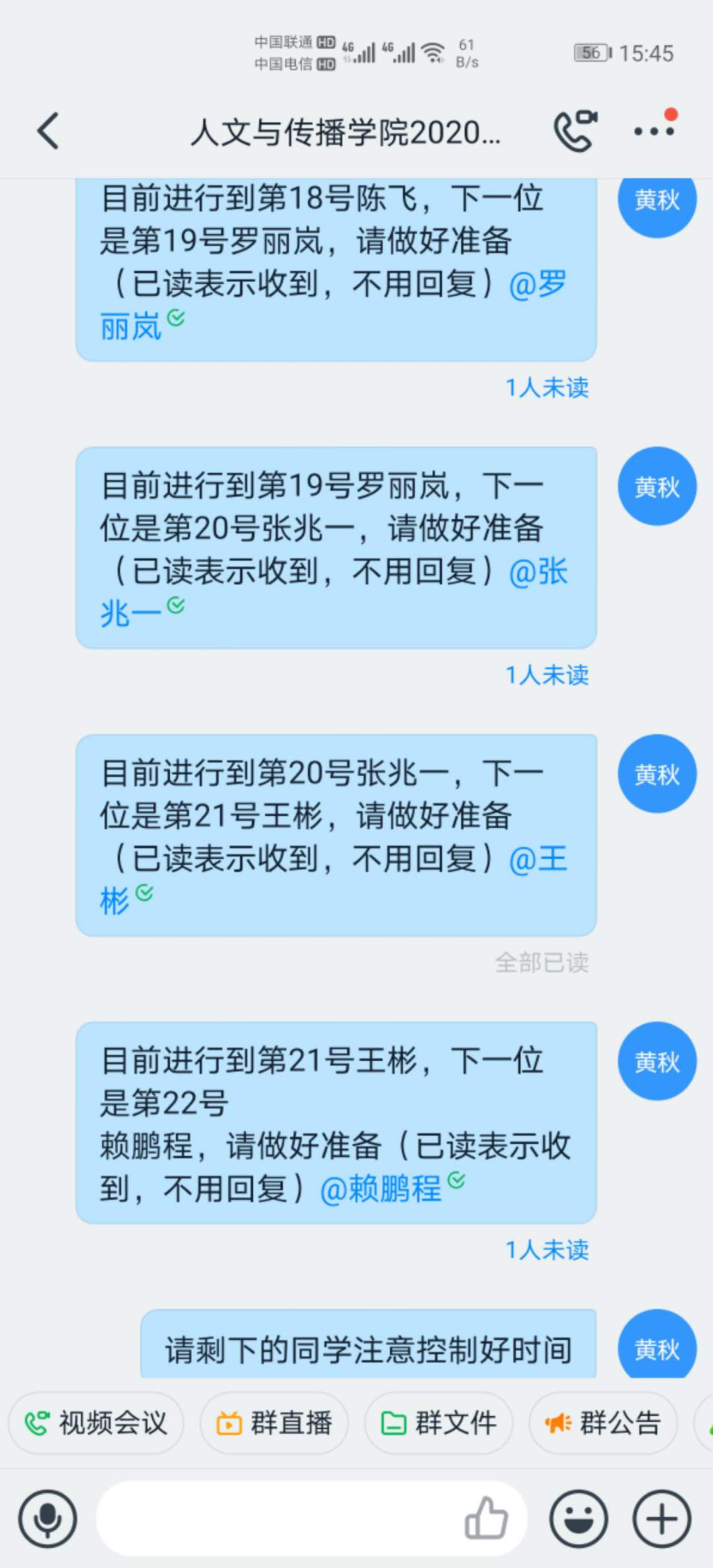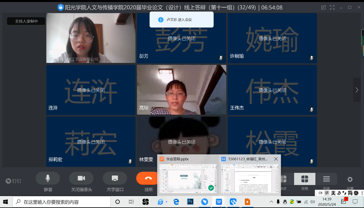 为落实学校对新型冠状病毒感染肺炎疫情防控工作部署,保障毕业生健康安全,根据集团相关文件精神,2020年5月23-24日,人文与传播学院组织2020届毕业生进行了毕业论文(设计)线上答辩。本次答辩邀请了来自福州大学、福建师范大学等高校高职称教师以及各行业专家参加答辩评审工作,我院郗永勤、张其春、杨吉华教授等24名教师担任答辩委员会委员。参加本次答辩的员工共275人,分13个小组在钉钉平台进行。
