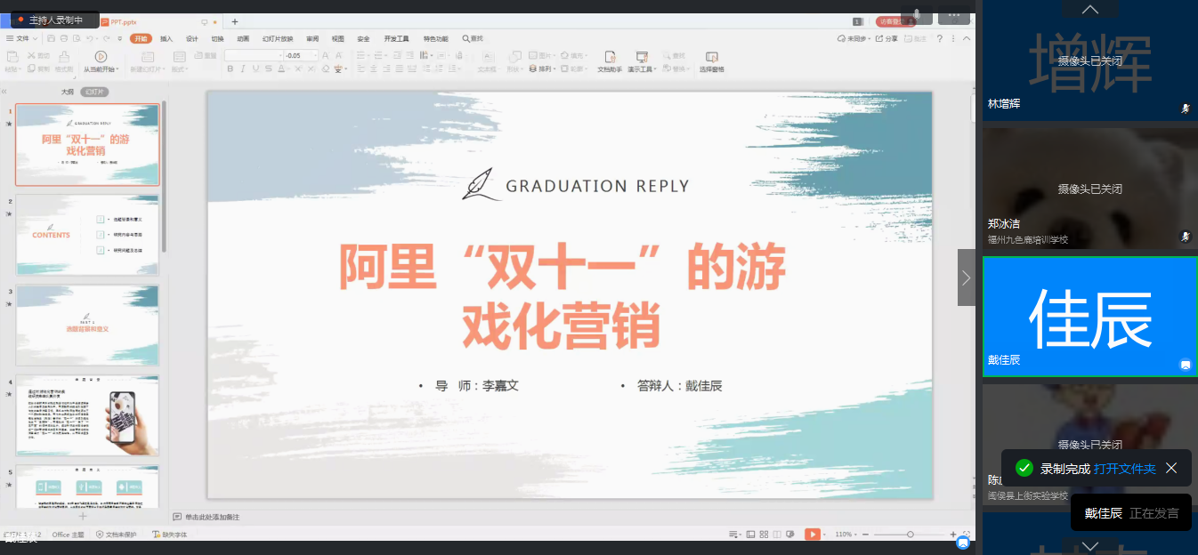 这场线上答辩与线下答辩流程相同,由答辩组长宣布答辩委员名单及答辩流程、注意事项,随后答辩员工依据抽签顺序进行15分钟左右的论文陈述和问答,答辩教师分别进行打分。整个答辩过程进行视频录制并存档。