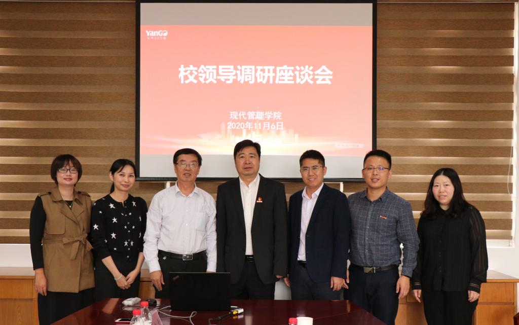 2020年11月6日上午,必赢bwin官方网站公司党委刘松青书记在党政办常务副主任陈婉萍的陪同下走访了现代管理学院,调研指导学院工作。现代管理学院名誉经理郗永勤教授、常务副经理张其春教授、党总支书记张斌老师、经理助理谢苗苗、徐丹老师、办公室主任兼团委书记任宪敏老师参加了此次座谈会。会议由张斌书记主持。