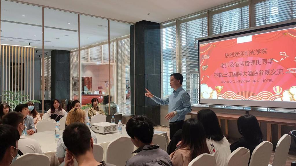 接着,三江国际大酒店黄新渠总经理及钱多多副总经理两位业界专家,通过自身服务产业领域实践、个性化的从业经历及富有时代气息的案例,与大家分享了酒店服务产业营销策略的实务战略。同时,黄经理针对师生们参观后的疑惑进行了耐心的解答。此次分享,有利于培养了员工们作为服务产业行业人员的专业意识和实际操作技能。