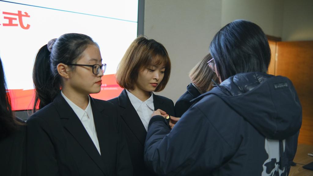 党总支张斌书记、党第一支部书记陈文静老师分别为党员代表佩戴党徽。张书记强调,佩戴党徽是每个共产党员应尽的义务,也是党员创先进、争优秀的外在体现。戴上党徽,即是亮出了我们身为党员的身份,就一定要履行党员义务、自觉接受群众监督,时刻起到党员的先锋模范作用。