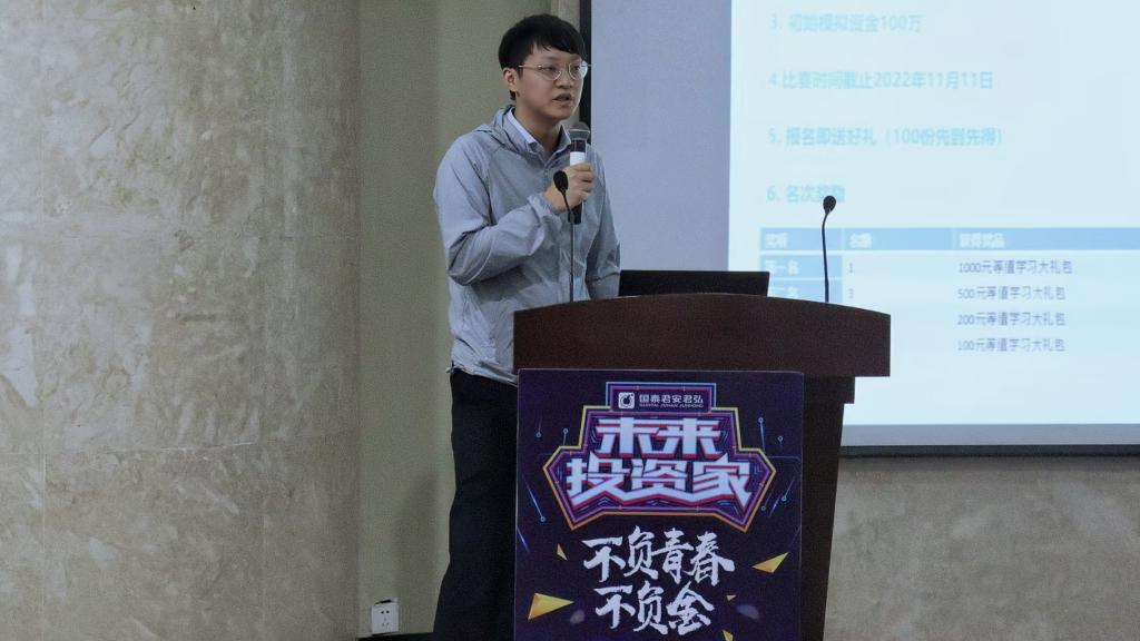 主讲人员首先对本次模拟投资大赛赛程进行讲解,并以自身参赛案例作为切入口,总结参赛技巧经验围绕数字金融、区块链两大内容进行策略分析,极大调动了学子们的参赛积极性。并指出,正确的投资理念应是遵循价格交易的原则,保持辩证思维,尊重市场、尊重趋势。他特别提醒大家,在投资中一定要规避风险,祝愿参赛学子在今后的大赛中一切顺利,收获丰硕。